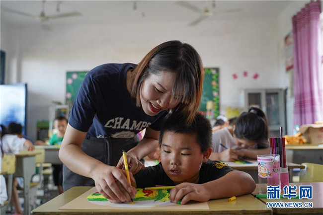 7月23日,在廬山市蛟塘鎮(zhèn)中心小學(xué)安置點(diǎn),一名老師在指導(dǎo)孩子繪畫。新華社記者 張浩波 攝