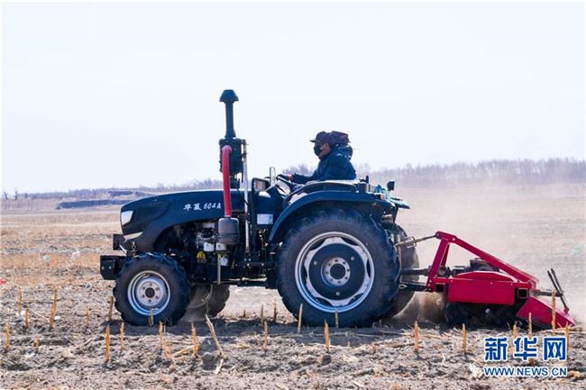 吉林省通榆縣邊昭鎮(zhèn)的村民在五井子村原址復(fù)墾的農(nóng)田上犁地(3月31日攝)。 新華社發(fā)(顏麟蘊(yùn) 攝)