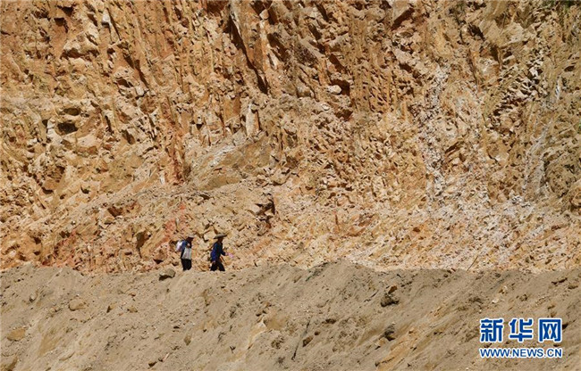 在烏英苗寨,70歲的老黨員梁安合(左)給正在產業(yè)路施工現場的村民送飯(7月30日攝)。 新華社記者 黃孝邦 攝