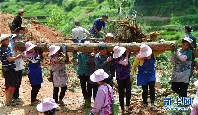 在烏英苗寨,村民們在山上扛木頭,為產業(yè)路施工做準備(7月30日攝)。 新華社記者 黃孝邦 攝