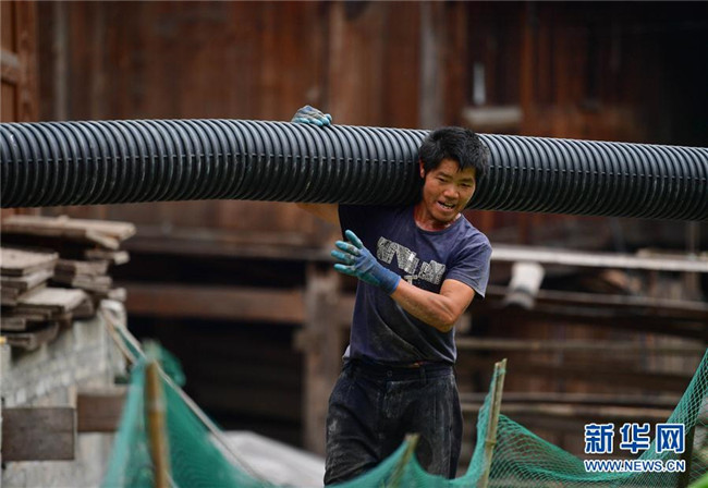 在烏英苗寨,村民在搬運排污管道,準備鋪設(7月7日攝)。 新華社記者 黃孝邦 攝
