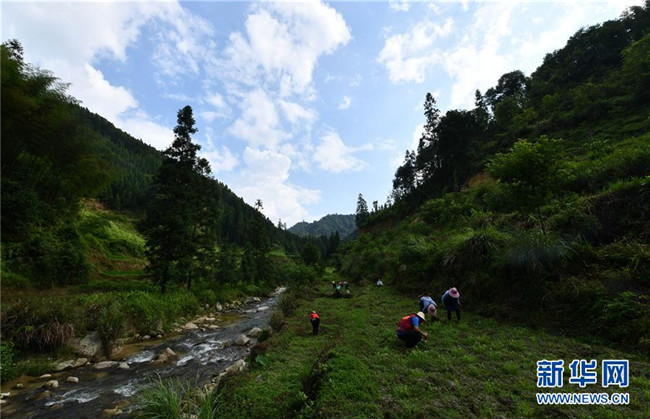 在烏英苗寨,小朋友給樹苗澆水(6月20日攝)。 新華社記者 黃孝邦 攝