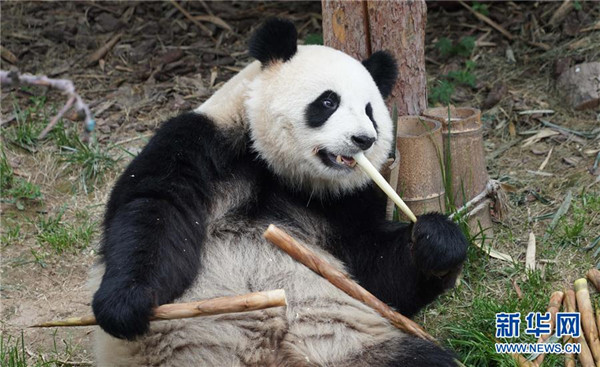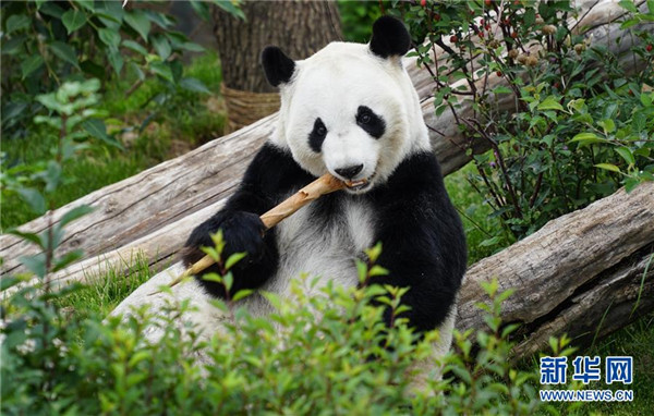 8月16日,大熊貓“園滿”在西寧熊貓館內(nèi)吃竹子。青海省西寧熊貓館的四只大熊貓已經(jīng)在西寧生活了一年多,在工作人員的悉心照顧下,已經(jīng)適應了青藏高原的氣候,身體各項指標正常。新華社記者耿輝凰攝