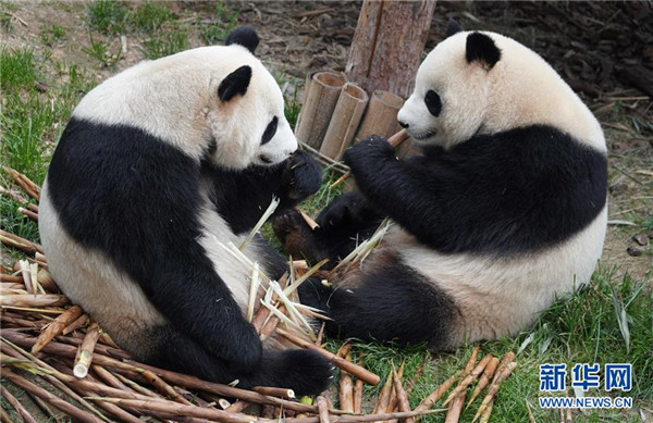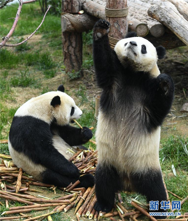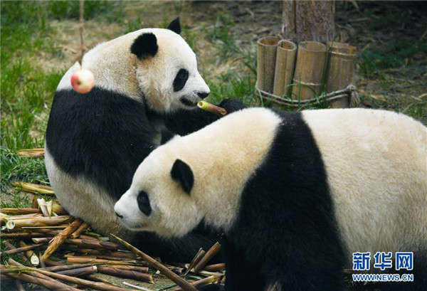 8月16日,大熊貓“奇果”(左)和“園滿”在西寧熊貓館內(nèi)玩耍。青海省西寧熊貓館的四只大熊貓已經(jīng)在西寧生活了一年多,在工作人員的悉心照顧下,已經(jīng)適應了青藏高原的氣候,身體各項指標正常。新華社記者薛玉斌攝