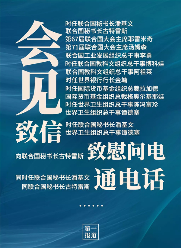 2013年以來,習主席通過會見、通話、致信函等多種方式同聯(lián)合國主要官員保持密切溝通。互動對象包括聯(lián)合國秘書長、聯(lián)合國大會主席,還有聯(lián)合國工業(yè)發(fā)展組織、聯(lián)合國教科文組織、世界銀行、國際貨幣基金組織、世界衛(wèi)生組織等聯(lián)合國專門機構(gòu)主要負責人。