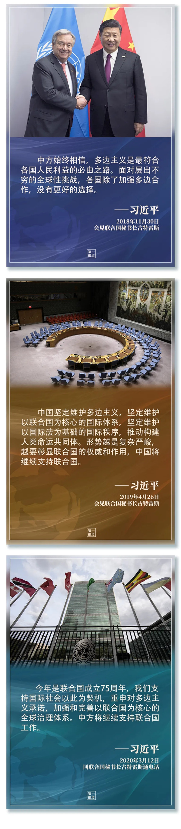 習主席指出,“支持聯(lián)合國發(fā)揮作用,維護聯(lián)合國權(quán)威和地位,是中國外交一項基本政策。”2013年以來,習主席多次會見聯(lián)合國主要官員,訪問聯(lián)合國總部及聯(lián)合國專門機構(gòu),出席一系列聯(lián)合國活動……親自推動中國同聯(lián)合國的合作,發(fā)出支持聯(lián)合國事業(yè)、捍衛(wèi)多邊主義的中國強音。
