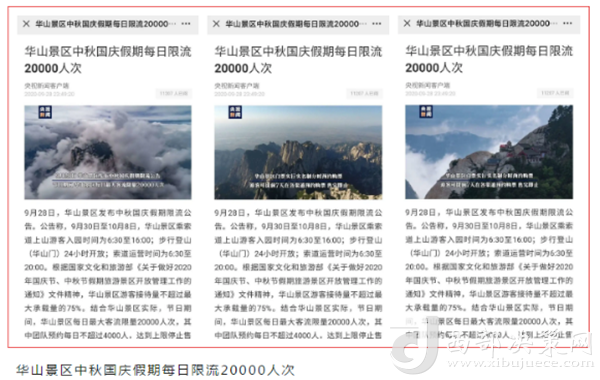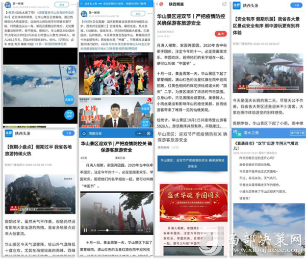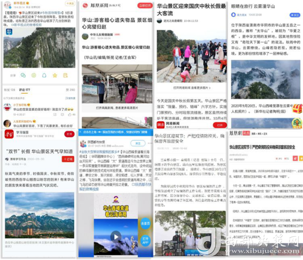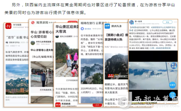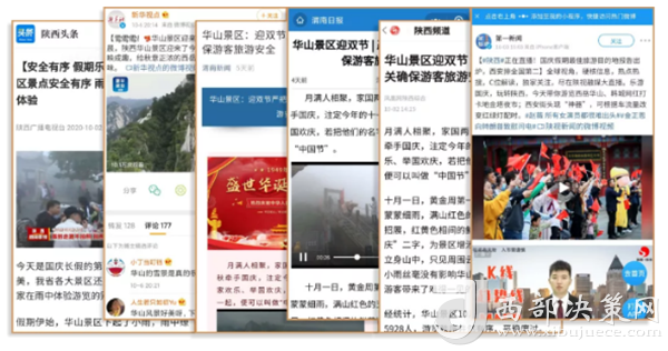 度節(jié)期間,通過央視cctv2【天下財(cái)經(jīng)】、cctv4、cctv13【新聞30分】、cctv13【新聞直播間】、央視網(wǎng)【國(guó)慶假期·出游】、央視網(wǎng)學(xué)習(xí)強(qiáng)國(guó)、央視新聞客戶端、新華社等國(guó)家級(jí)媒體對(duì)景區(qū)度節(jié)工作、游覽秩序、特色服務(wù)等方面進(jìn)行轟炸式報(bào)道;聯(lián)合陜西日?qǐng)?bào)、陜西電視臺(tái)、渭南日?qǐng)?bào)、渭南電視臺(tái)、三秦都市報(bào)、陜西旅游資訊、騰訊網(wǎng)、新浪網(wǎng)、網(wǎng)易陜西、鳳凰陜西等30余家主流媒體對(duì)景區(qū)度節(jié)期間各項(xiàng)工作及實(shí)時(shí)風(fēng)景進(jìn)行跟蹤報(bào)道,共計(jì)發(fā)布各類宣傳稿件239篇,全面提升景區(qū)旅游熱度。