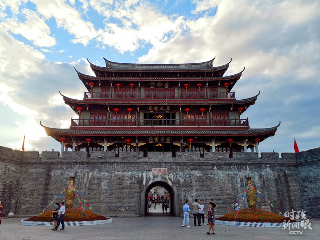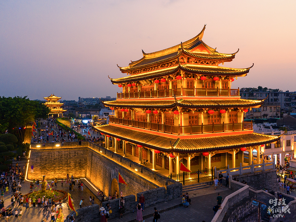 △修復(fù)后的廣濟(jì)門城樓高24.5米,城樓上的“東為萬春”和“嶺東首邑”分別由國際漢學(xué)大師饒宗頤、書法家劉炳森題寫。(總臺(tái)央視記者楊立峰拍攝)