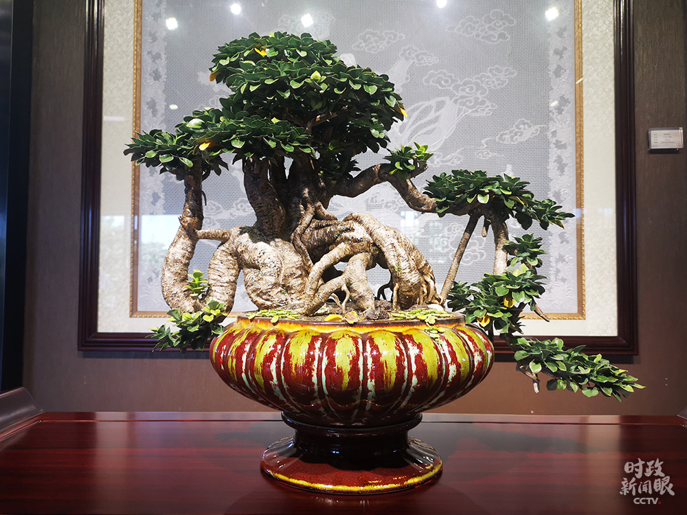△楓溪瓷燒制技藝是國家級(jí)非物質(zhì)文化遺產(chǎn)之一,這是作品《榕樹盆景》。(總臺(tái)央視記者張曉鵬拍攝)