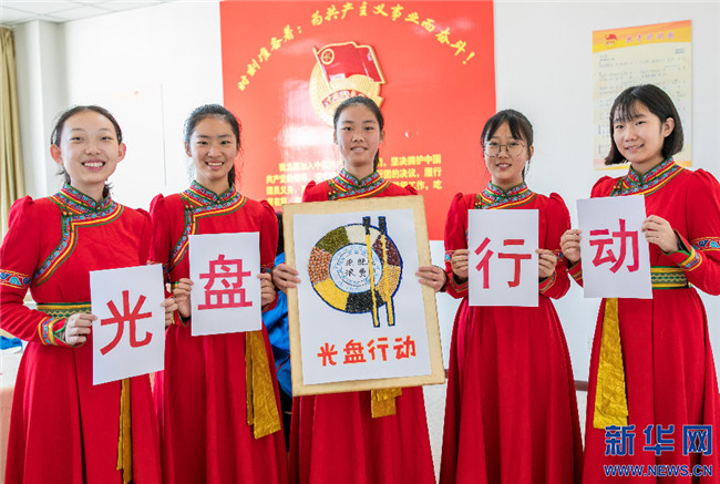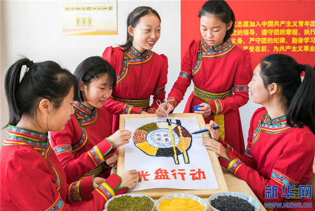 15日,內(nèi)蒙古呼和浩特市第二十六中學(xué)學(xué)生展示“光盤(pán)行動(dòng)”趣味糧食貼畫(huà)。新華網(wǎng)發(fā)(丁根厚攝)