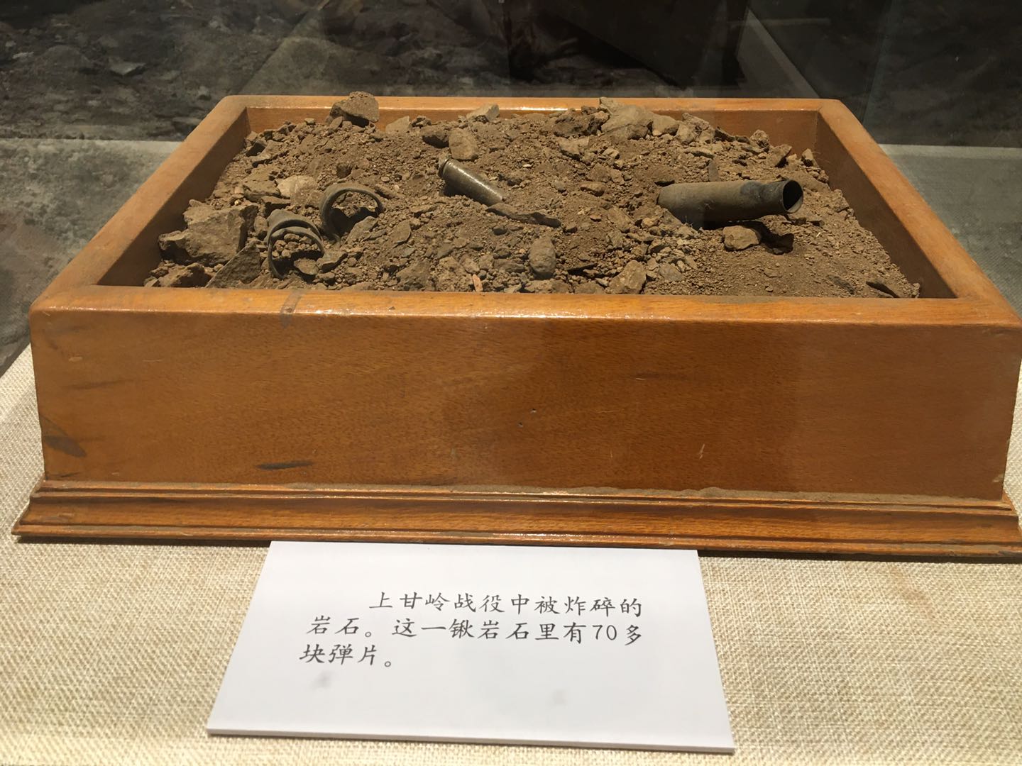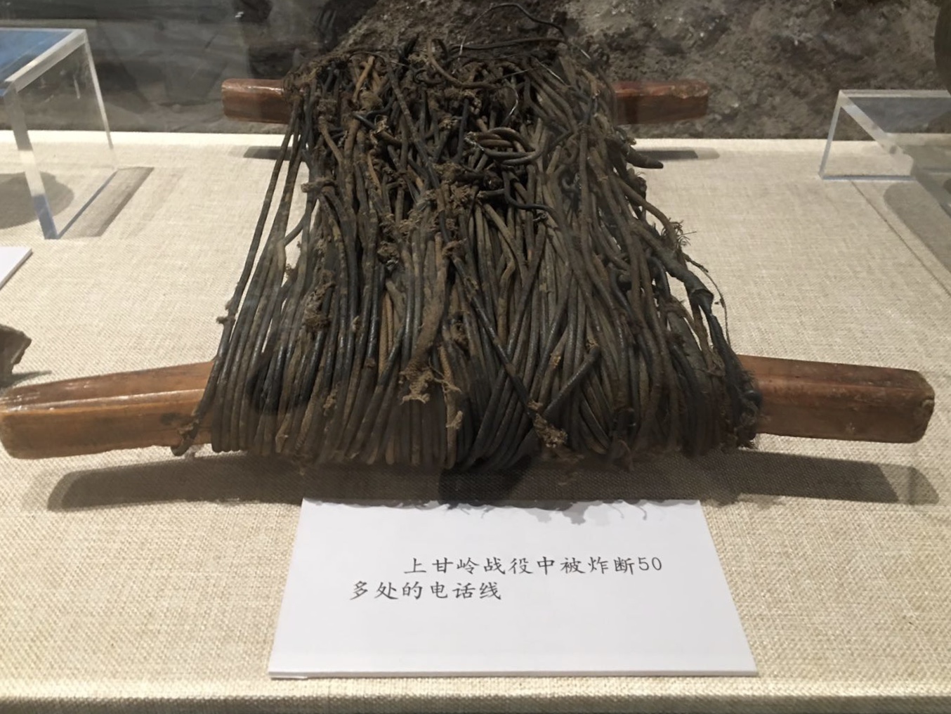 在軍博的主題展覽“血戰(zhàn)上甘嶺”展區(qū),幾件戰(zhàn)場(chǎng)實(shí)物似乎還能讓人聞到當(dāng)年的殘酷硝煙:一截嵌滿彈片的枯樹干,一堆摻雜著彈片的碎石焦土,被炸斷50多處的200多米電話線……