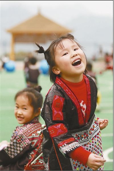 貴州省黔東南苗族侗族自治州劍河縣幸福社區(qū)中心幼兒園,易地扶貧搬遷戶的子女們身著民族服裝,樂(lè)享趣味游戲。 |