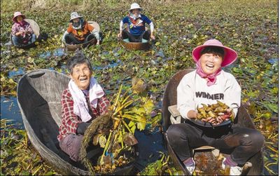安徽省宣城市宣州區(qū)朱橋鄉(xiāng)渾水村,村民們正在采收菱角。這里是典型的水鄉(xiāng),產(chǎn)出的菱角品質(zhì)極佳。通過(guò)種植菱角,每位村民可增收4000多元。 |