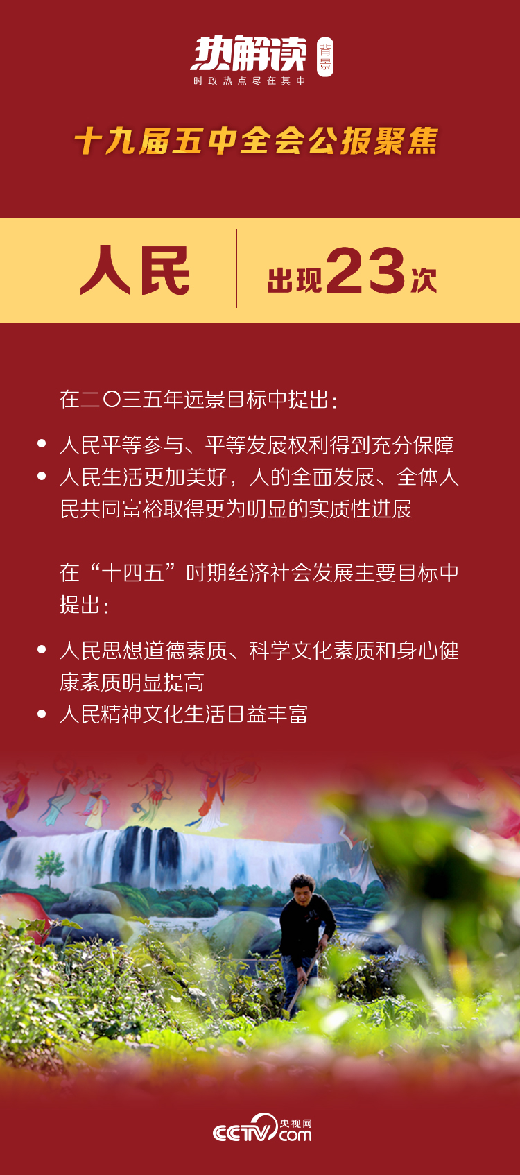 6000多字的公報中,“人民”一詞出現(xiàn)23次。“人民平等參與、平等發(fā)展權(quán)利得到充分保障”“人民精神文化生活日益豐富”“改善人民生活品質(zhì)”“不斷增強(qiáng)人民群眾獲得感、幸福感、安全感”“提高人民收入水平”“保障人民生命安全”……字字句句,都圍繞著“人民”二字,映射出以習(xí)近平同志為核心的黨中央,率領(lǐng)9000多萬名中國共產(chǎn)黨員為人民謀幸福、為民族謀復(fù)興的奮斗圖景。