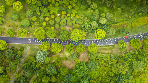 在江蘇省淮安市,體育愛好者在淮安森林公園進行“全民健步走”活動(8月7日攝,無人機照片)。新華社發(fā)(干石泉 攝)