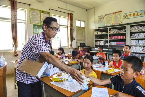 在廣西武宣縣二塘鎮(zhèn)雙桂小學,老師韋旭禧給學生們發(fā)牛奶(6月19日攝)。新華社記者 曹祎銘 攝