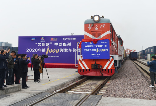10月21日,2020年第1000列“義新歐”中歐班列從鐵路義烏西站發(fā)車。新華社發(fā)(龔獻明 攝)
