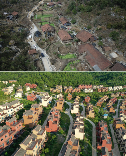 拼版照片上圖:這是整屯搬遷前的廣西南丹縣里湖瑤族鄉(xiāng)董甲村么干屯(2018年1月10日攝)。村民們都搬遷到“千家瑤寨·萬戶瑤鄉(xiāng)”里湖王尚易地扶貧搬遷安置點。下圖:這是廣西南丹縣“千家瑤寨·萬戶瑤鄉(xiāng)”里湖王尚易地扶貧搬遷安置點(8月4日攝,無人機照片)。新華社記者 周華 攝