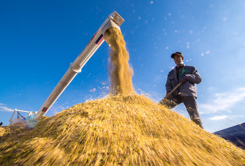 在吉林省吉林市一拉溪鎮(zhèn),農(nóng)民在運糧車上整理收割機收獲的水稻(2018年9月17日攝)。新華社記者 許暢 攝