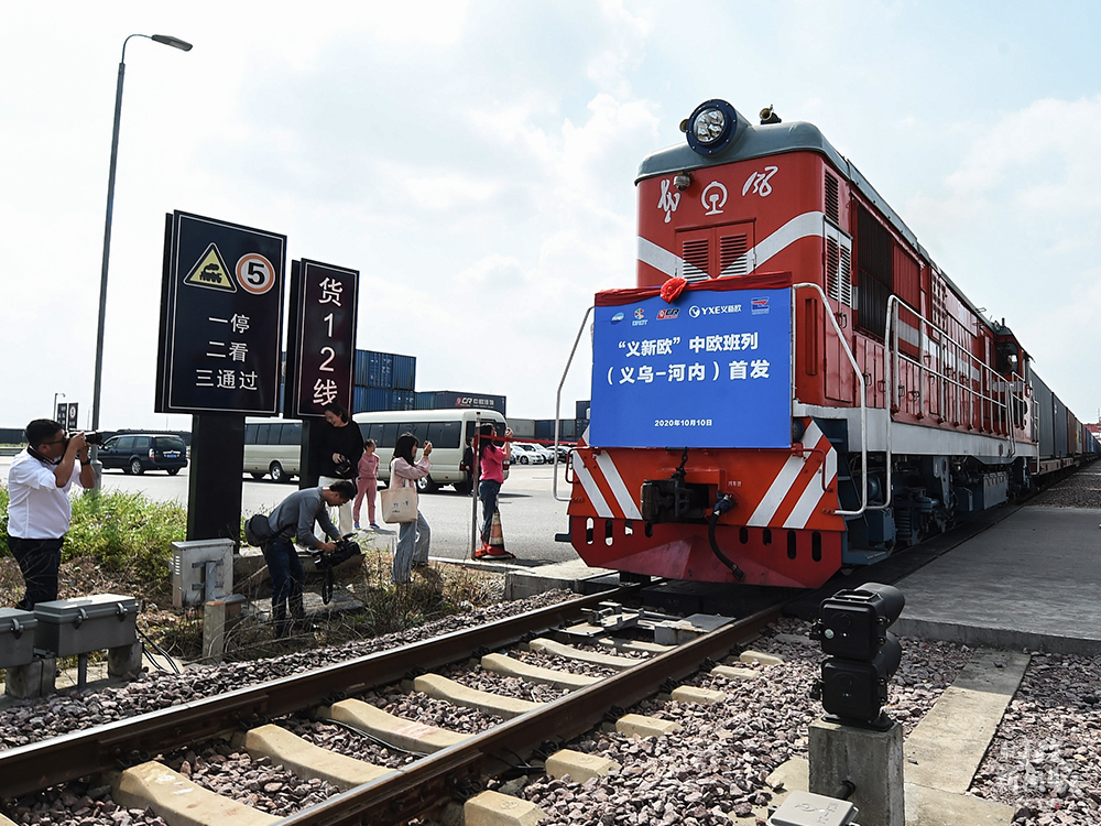 △今年10月10日,“義新歐”中歐班列(義烏—河內(nèi))從義烏西站首發(fā)啟程,最終將抵達越南河內(nèi)站。這是該班列首次開通面向東南亞國家和地區(qū)的南向通道。