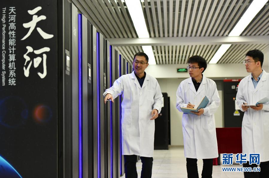 在國家超級計算天津中心“天河三號”原型機機房內(nèi),應(yīng)用研發(fā)部部長孟祥飛(左)和同事一起巡查(2019年4月24日攝)。新華社記者 李然 攝