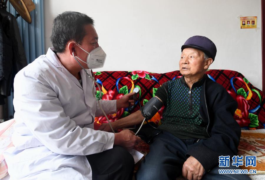 河北阜平縣龍泉關(guān)鎮(zhèn)顧家臺村村醫(yī)為村民測量血壓(4月15日攝)。新華社記者 王曉 攝