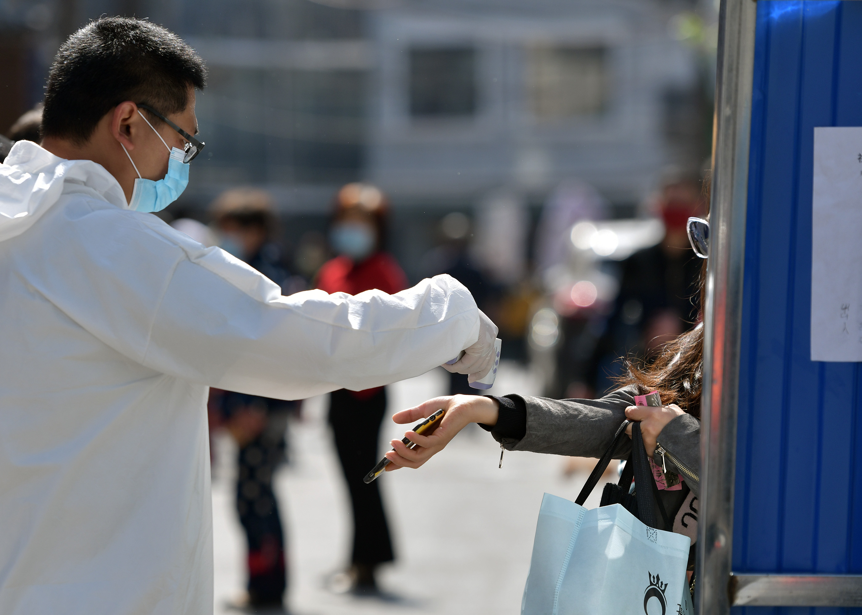4月15日,值守在湖北武漢市武昌楚材社區(qū)出入卡口的工作人員為出入者測(cè)體溫。新華社記者 李賀 攝