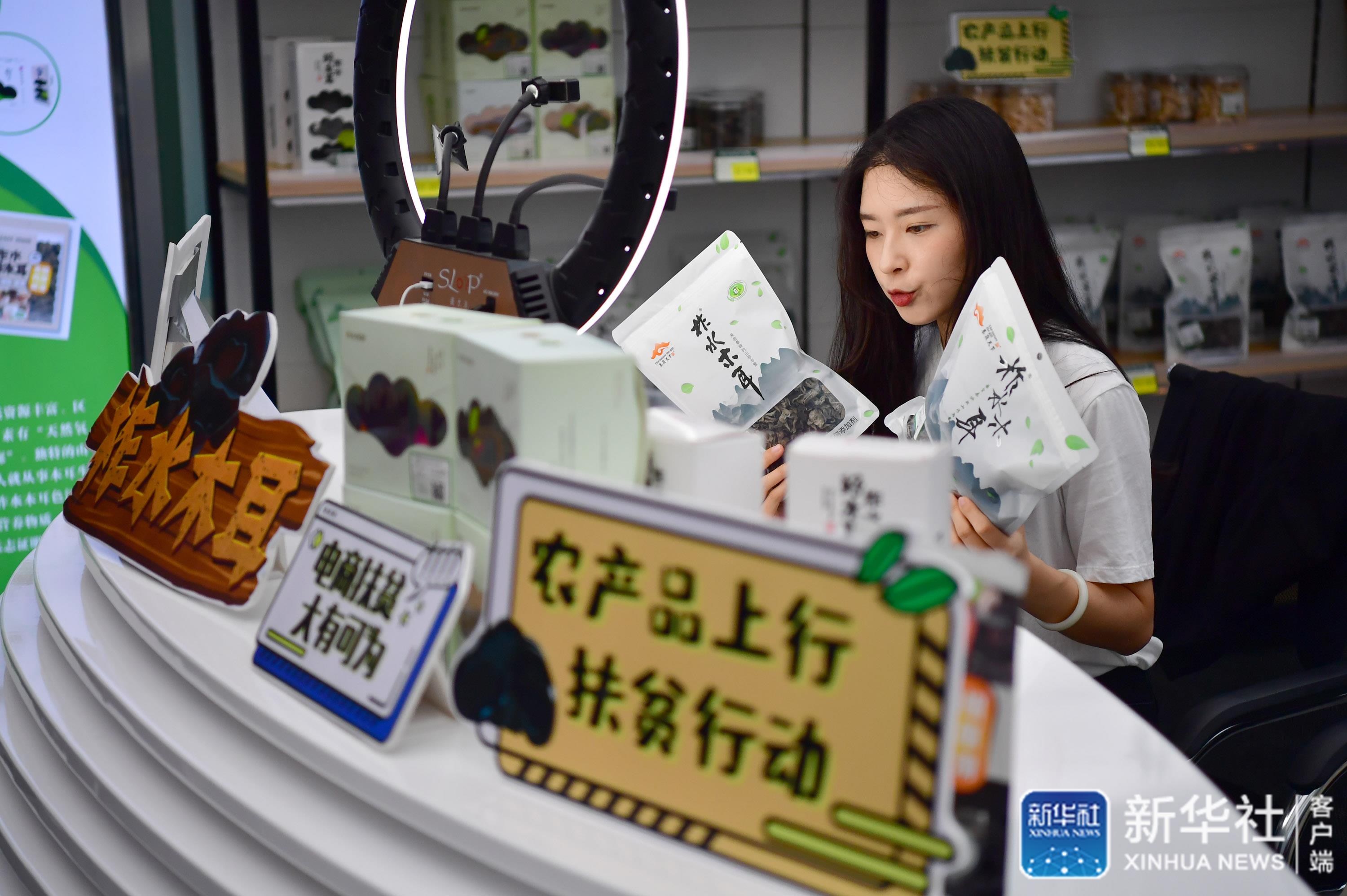 7月21日,在陜西柞水縣小嶺鎮(zhèn)金米村木耳展銷中心內(nèi),電商主播何錦漪通過直播售賣柞水木耳。新華社記者 邵瑞 攝