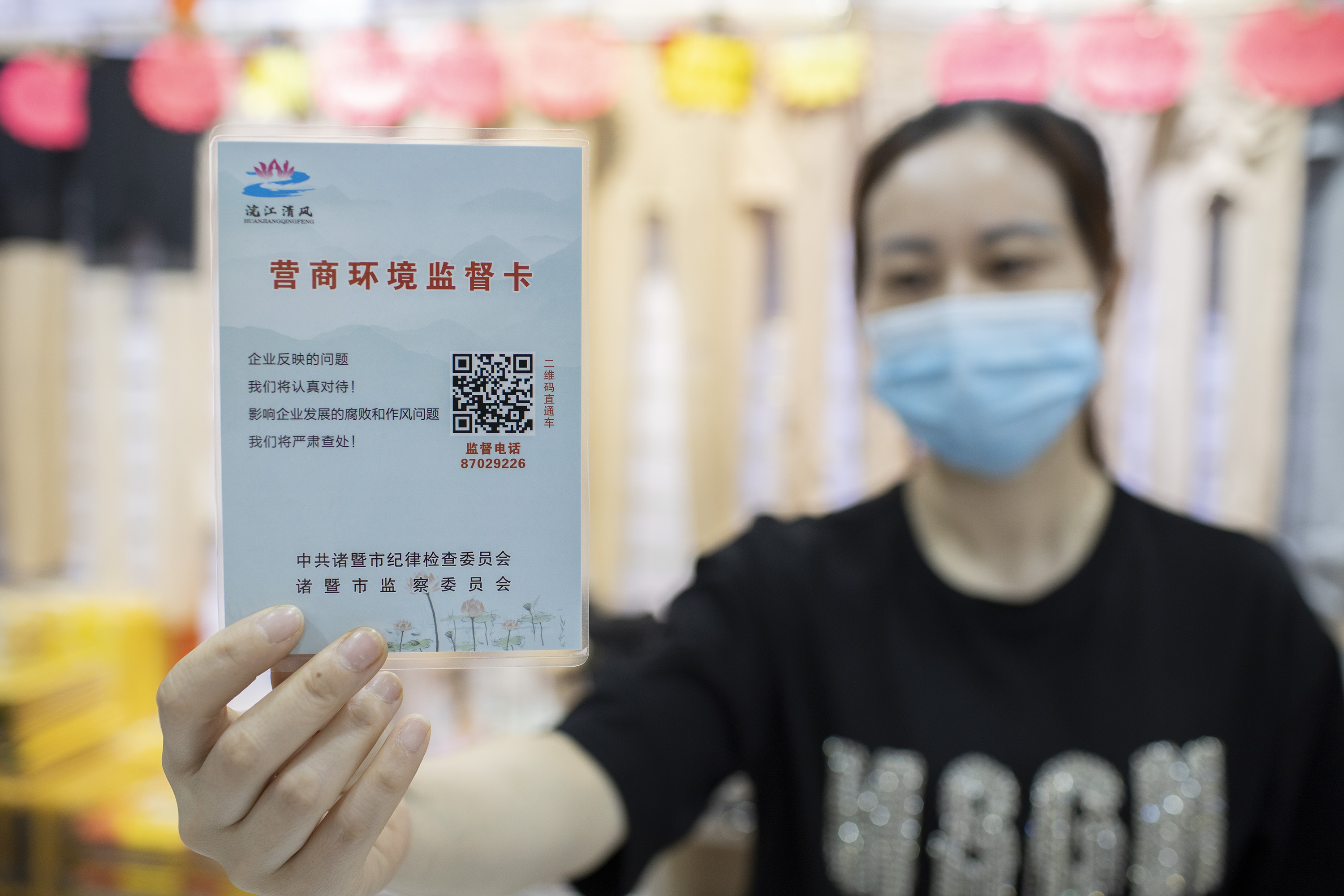 5月12日,浙江諸暨市一經(jīng)營(yíng)戶在展示“營(yíng)商環(huán)境監(jiān)督卡”。諸暨市推出“營(yíng)商環(huán)境監(jiān)督卡”,助力復(fù)工復(fù)產(chǎn),服務(wù)保障經(jīng)濟(jì)穩(wěn)健發(fā)展。新華社發(fā)(郭斌 攝)