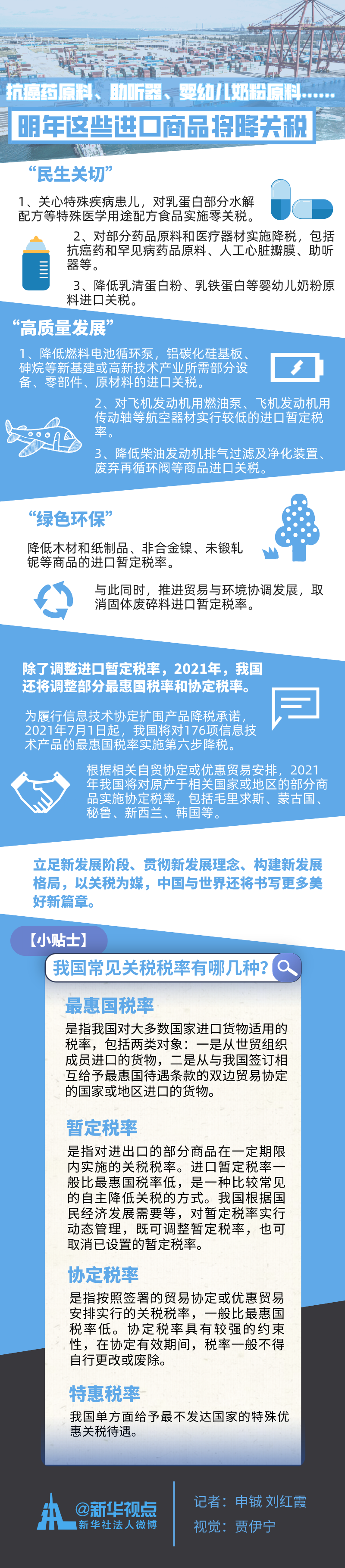 每逢年末,我國都會(huì)根據(jù)經(jīng)濟(jì)社會(huì)發(fā)展情況對新一年的部分商品的關(guān)稅稅率進(jìn)行調(diào)整。國務(wù)院關(guān)稅稅則委員會(huì)23日印發(fā)2021年關(guān)稅調(diào)整方案,決定從明年1月1日開始,對883項(xiàng)商品實(shí)施低于最惠國稅率的進(jìn)口暫定稅率,抗癌藥原料、助聽器、嬰幼兒奶粉原料等跟百姓生活密切相關(guān)的商品均在其中。同時(shí),隨著中國對外開放持續(xù)擴(kuò)大,部分協(xié)定稅率、最惠國稅率也將在明年降低。(記者申鋮、劉紅霞)