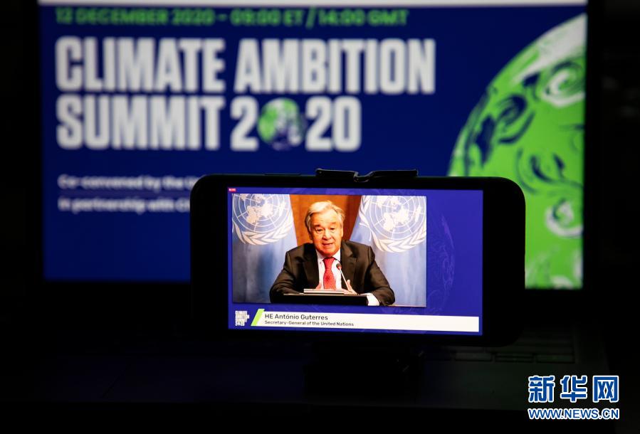 這是2020年12月12日在美國紐約拍攝的聯(lián)合國秘書長古特雷斯在氣候雄心峰會上通過視頻發(fā)表講話的屏幕畫面。氣候雄心峰會由聯(lián)合國及有關(guān)國家倡議舉辦,旨在紀(jì)念《巴黎協(xié)定》達成五周年,進一步動員國際社會強化氣候行動,推進多邊進程。新華社記者 王迎 攝