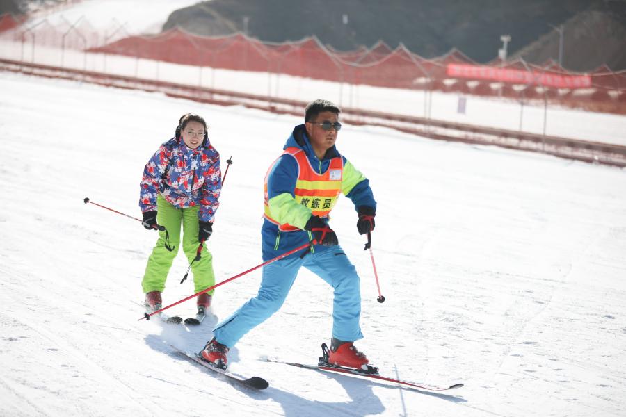 ▲ 1月8日,在甘肅白銀國家雪上項目訓(xùn)練基地,一名教練指導(dǎo)滑雪愛好者滑雪。新華社記者 馬希平 攝