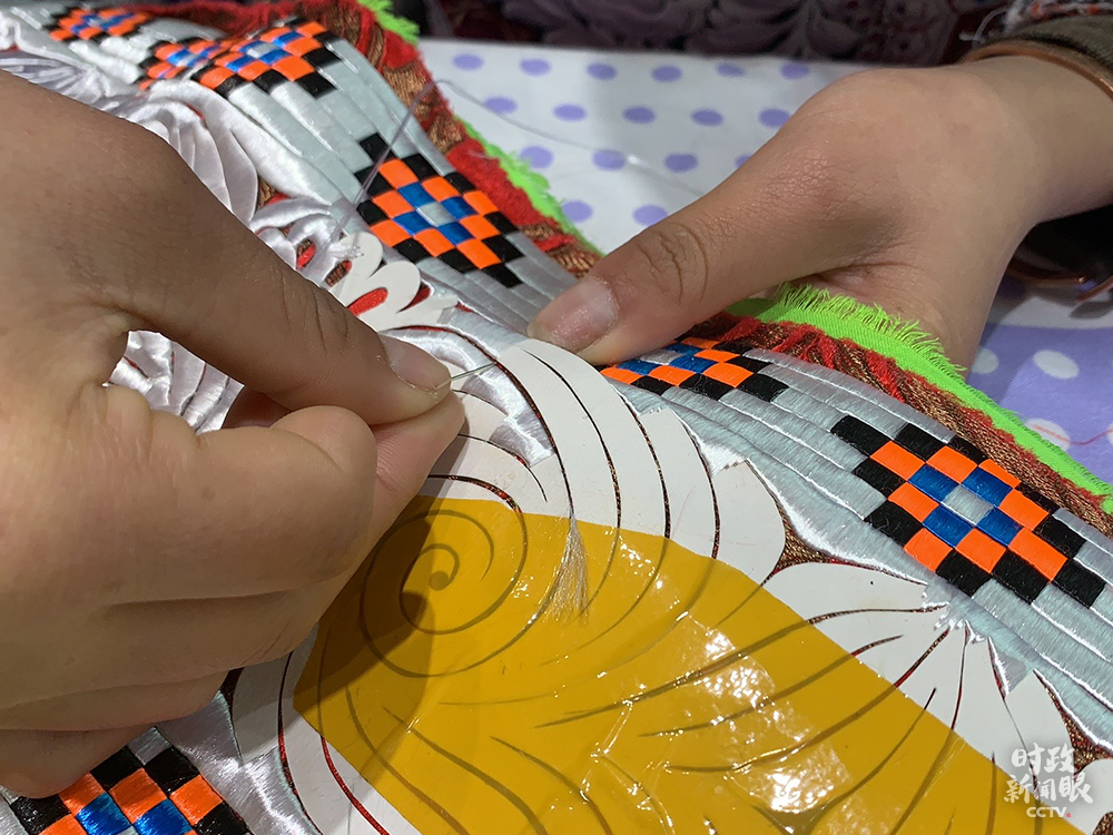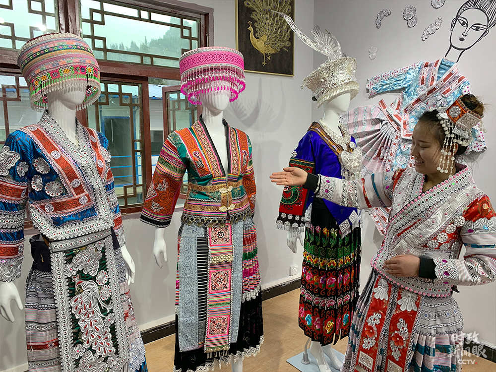 25歲的楊文麗是這家扶貧車間的負責人,她的刺繡手藝是從小跟母親學的。楊文麗告訴《時政新聞眼》,苗繡分手工繡和機繡。一件手工繡的“歪梳苗服飾”要賣到上萬元。如今,車間的苗繡成品有近70%是通過直播帶貨銷售出去的。
