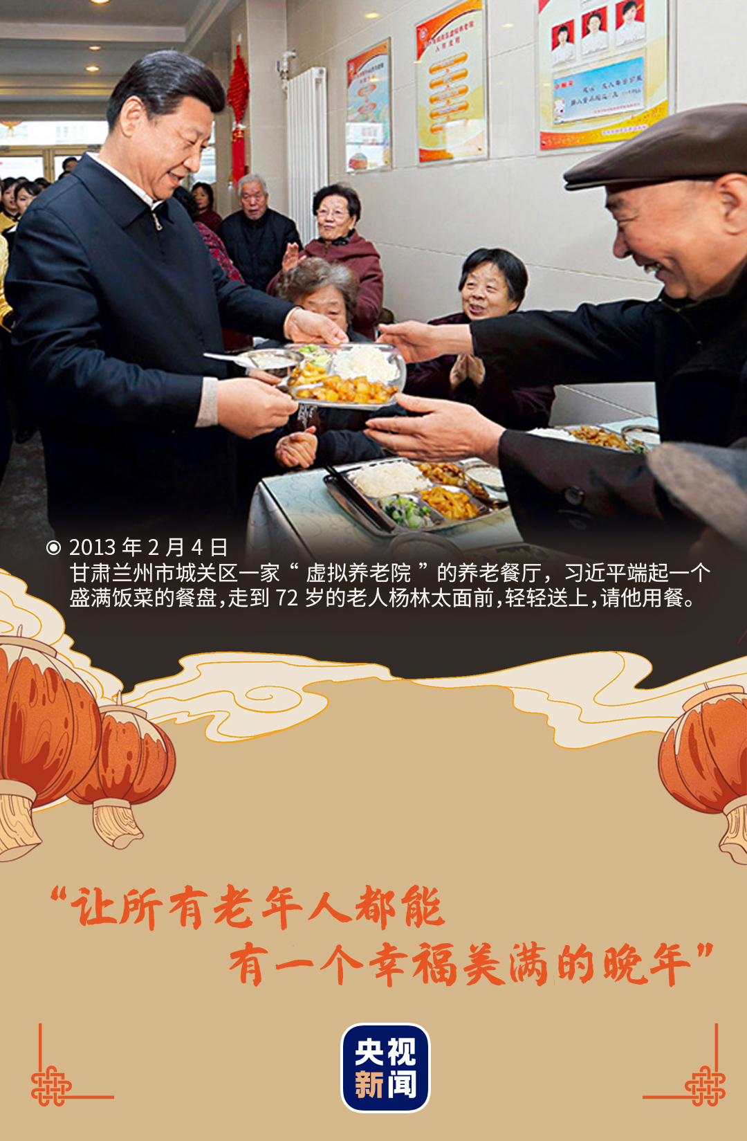 在各地考察中,習(xí)近平一次次走進(jìn)鄉(xiāng)村、社區(qū)、養(yǎng)老機(jī)構(gòu)和養(yǎng)老服務(wù)站,與老人們親切交流,叮囑要給予他們更多關(guān)心。在蘭州“虛擬養(yǎng)老院”的養(yǎng)老餐廳,總書記親自給老人遞飯菜;在北京四季青敬老院,總書記觀看老人作畫、手工制作、排練合唱等,祝福他們健康長壽……