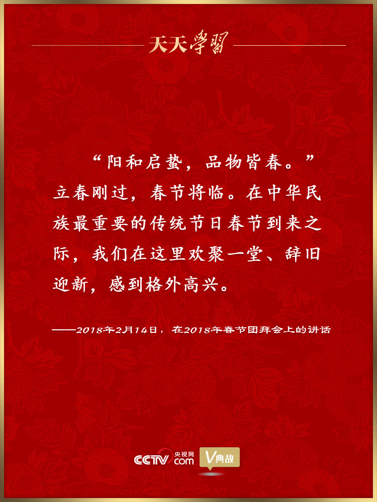 黨的十八大以來,習(xí)近平總書記多次在臘月二十九舉行的春節(jié)團(tuán)拜會(huì)上發(fā)表重要講話,盤點(diǎn)舊歲、謀劃新年,向全國(guó)各族人民、港澳臺(tái)同胞和海外僑胞拜年,并致以美好的新春祝福。在講話中,習(xí)近平總書記頻頻引用具有新春節(jié)令特點(diǎn)的古代經(jīng)典詩文名句抒發(fā)情懷、暢想未來。這些詩文名句如春風(fēng)化雨潤(rùn)人心田、暖人心扉,激勵(lì)著億萬人民在新的一年里追夢(mèng)前行。