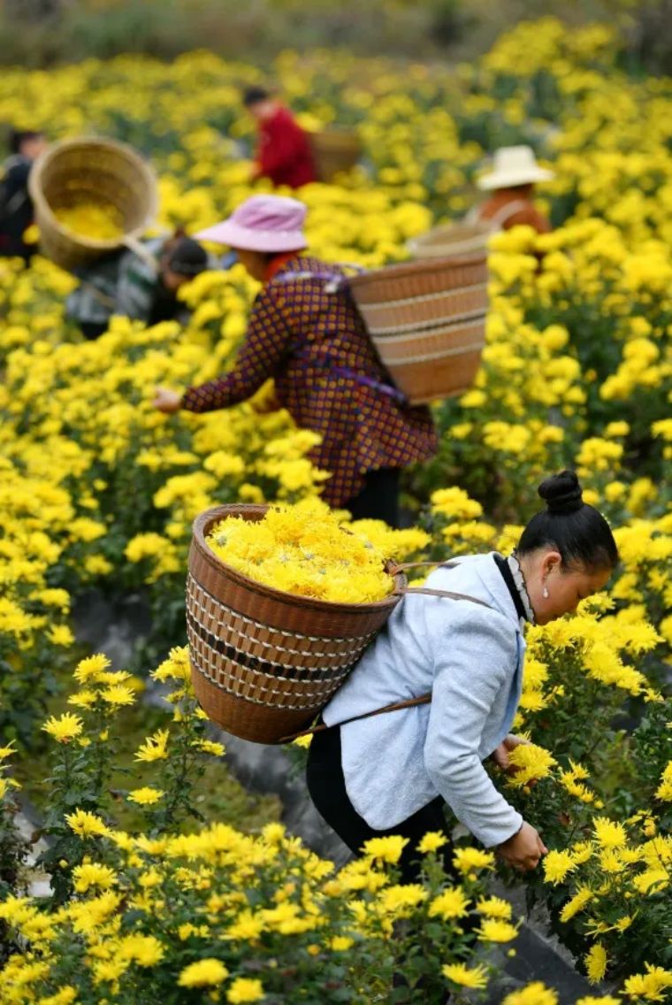 ↑2020年10月29日,湖北省恩施土家族苗族自治州宣恩縣曉關侗族鄉(xiāng)黃草壩村農民在采摘金絲皇菊。在當?shù)囟弊迦罕娋劬訁^(qū),農民們在駐村扶貧工作隊的引導下積極種植金絲皇菊。“合作社+基地+農戶”的種植模式提高了農民抵御市場風險的能力,激發(fā)了農民耕作土地的積極性,促進深山侗族群眾脫貧增收。