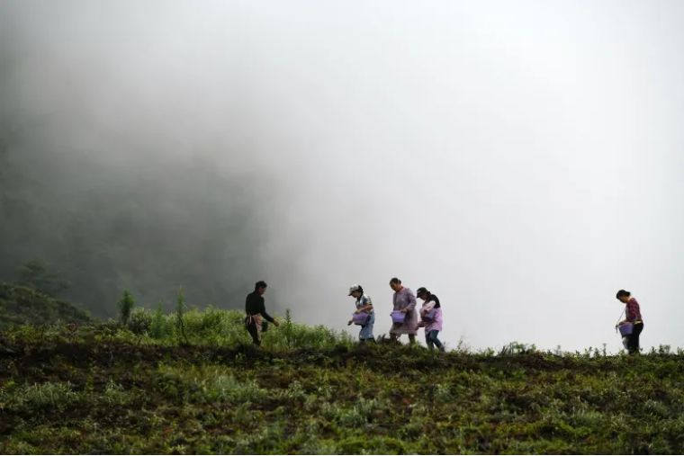 ↑2019年7月7日,農民在貴州省普安縣地瓜鎮(zhèn)屯上村的“扶貧茶園”里給茶苗施肥。為幫助貧困地區(qū)群眾脫貧,2018年浙江安吉黃杜村將“白葉一號”白茶苗捐贈給貴州省普安縣、沿河土家族自治縣,湖南省古丈縣,四川省青川縣等3省4縣,覆蓋貧困戶1862戶。