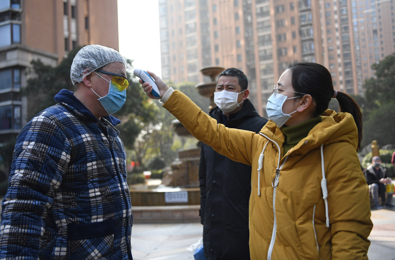 △2020年1月31日,在江西省南昌市西湖區(qū)一社區(qū)門口,一位青年街道干部(右一)為居民測量體溫。