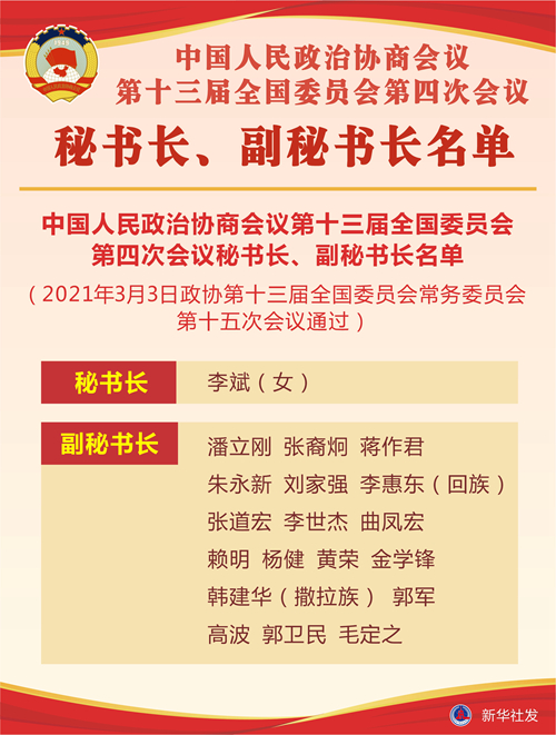 中國人民政治協(xié)商會(huì)議第十三屆全國委員會(huì)第四次會(huì)議秘書長、副秘書長名單