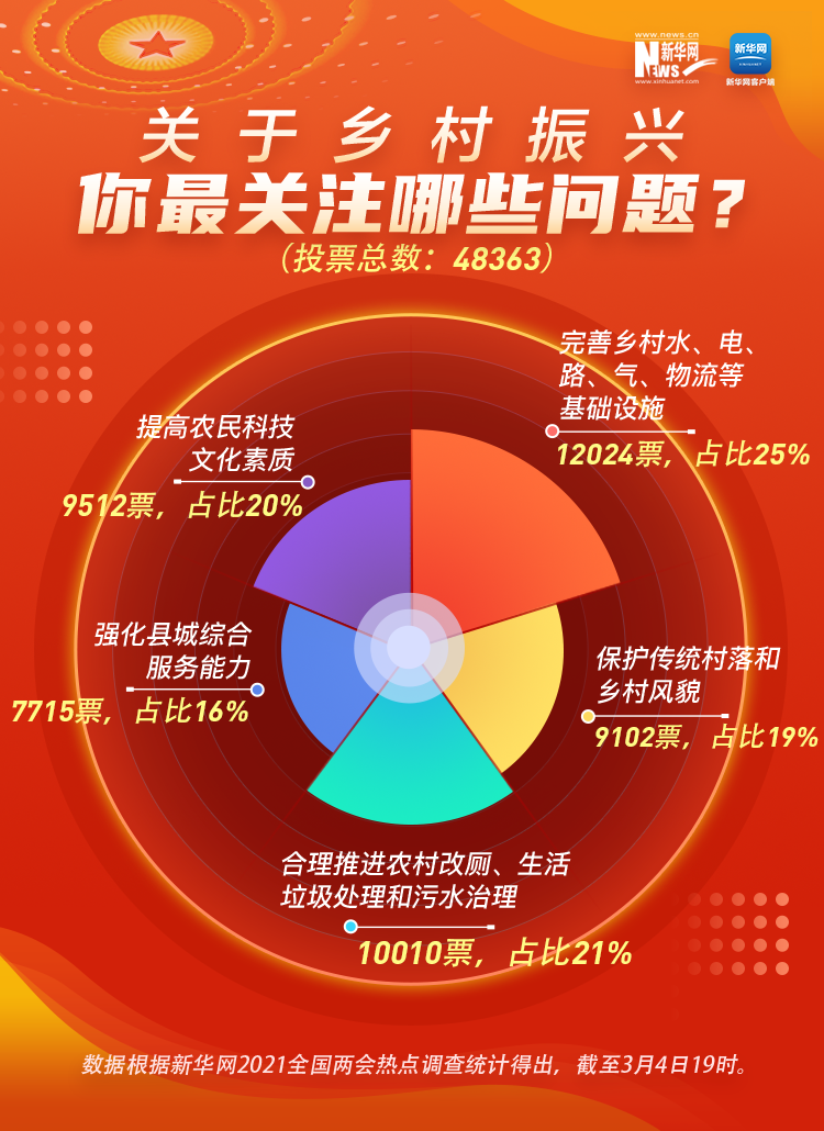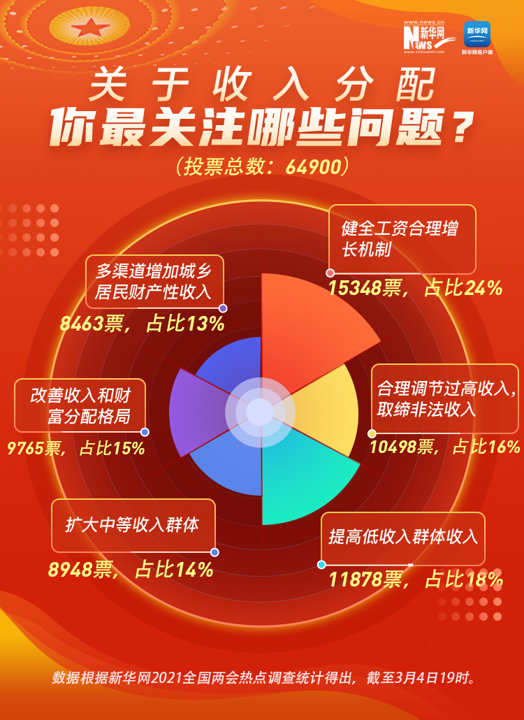 民之所望,政之所向。全國政協(xié)十三屆四次會議3月4日在北京開幕,2021年全國兩會正式開啟。今年你最關心什么事?在新華網(wǎng)前期推出的2021全國兩會熱點調查中,收入分配、鄉(xiāng)村振興、“十四五”規(guī)劃、疫情防控、就業(yè)創(chuàng)業(yè)、養(yǎng)老保障等成為網(wǎng)民關注的熱點話題。