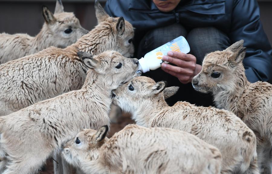 2020年7月7日,三江源國家公園管理局長江源園區(qū)可可西里管理處卓乃湖保護站的工作人員才文多杰在給藏羚羊幼仔喂奶。新華社記者 薛玉斌 攝