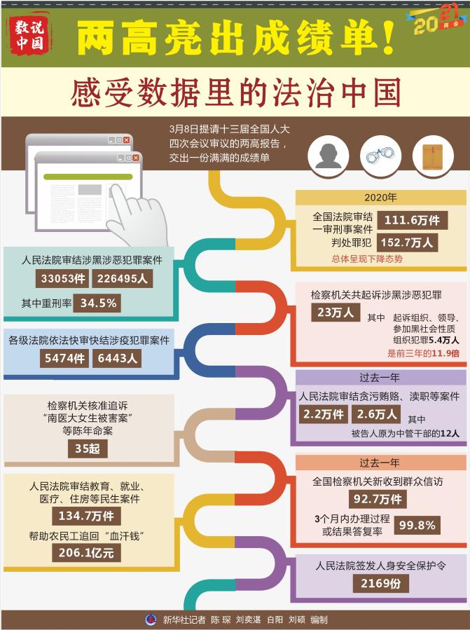 8日提請(qǐng)十三屆全國人大四次會(huì)議審議的兩高報(bào)告,交出一份滿滿的成績單。掃黑除惡“打傘破網(wǎng)”、嚴(yán)懲腐敗守護(hù)平安、加強(qiáng)民生司法保障……一串串?dāng)?shù)字勾勒出法治中國建設(shè)的亮點(diǎn)。