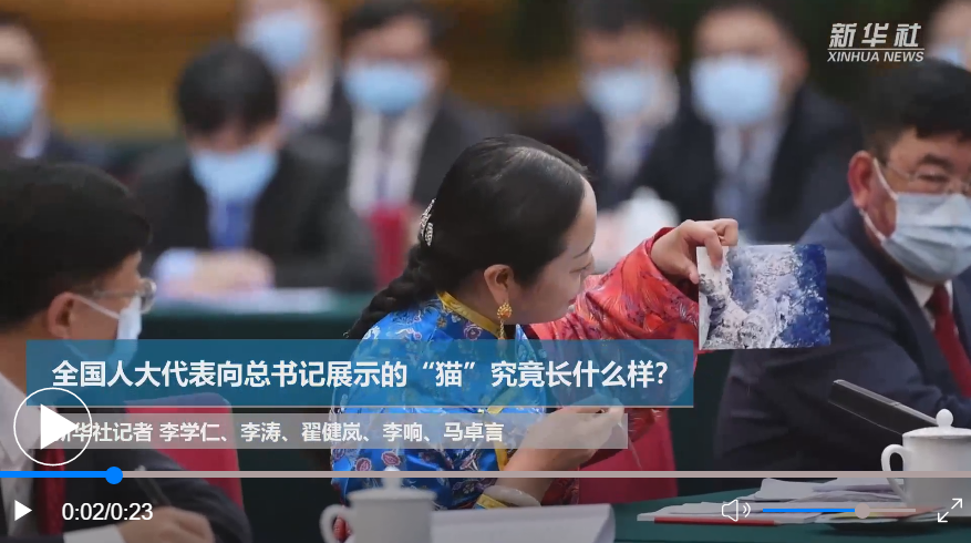 在會議現(xiàn)場,全國人大代表、青海省海北藏族自治州門源回族自治縣教育局教研室副主任孔慶菊拿出兩張照片,向習總書記展示了兩種可愛的“貓”。