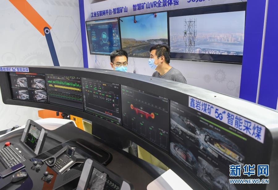 在武漢中國(guó)光谷科技會(huì)展中心舉行的2020中國(guó)5G+工業(yè)互聯(lián)網(wǎng)大會(huì)上,參觀者了解一套5G智能采煤系統(tǒng)(2020年11月19日攝)。新華社記者 程敏 攝
