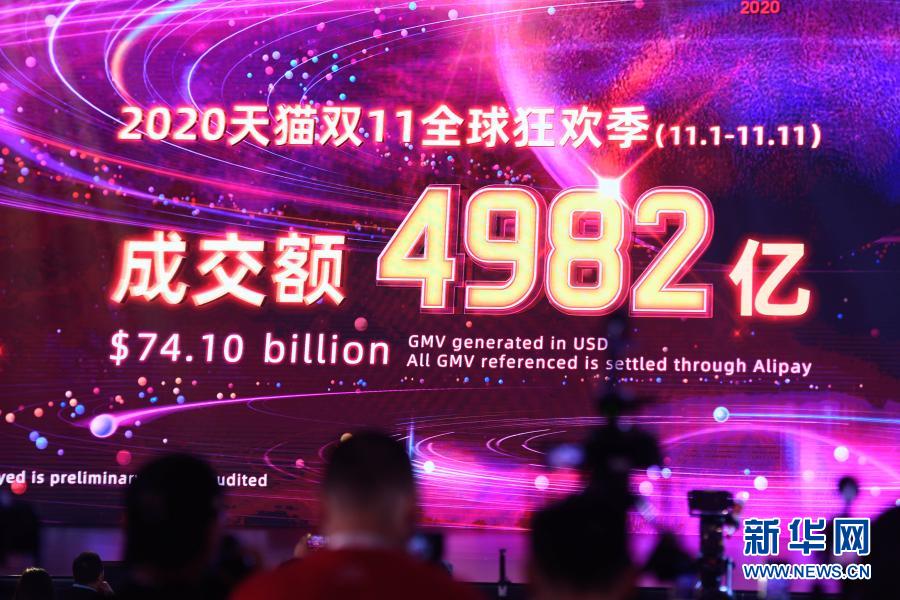 在浙江杭州未來(lái)科技城學(xué)術(shù)交流中心,大屏幕顯示阿里巴巴旗下天貓“雙11”成交額超過(guò)4982億元(2020年11月12日攝)。新華社記者 黃宗治 攝