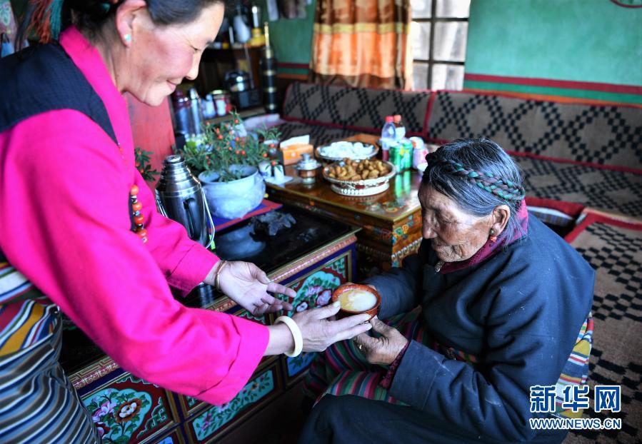 女兒給巴桑獻(xiàn)酥油茶(2月27日攝)。新華社記者 孫非 攝