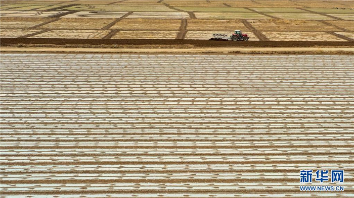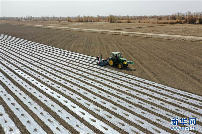 在新疆尉犁縣塔里木鄉(xiāng)英努爾村,農(nóng)民駕駛大馬力拖拉機在棉田里進行鋪膜作業(yè)(3月28日攝)。新華社發(fā)(汪志鵬 攝)