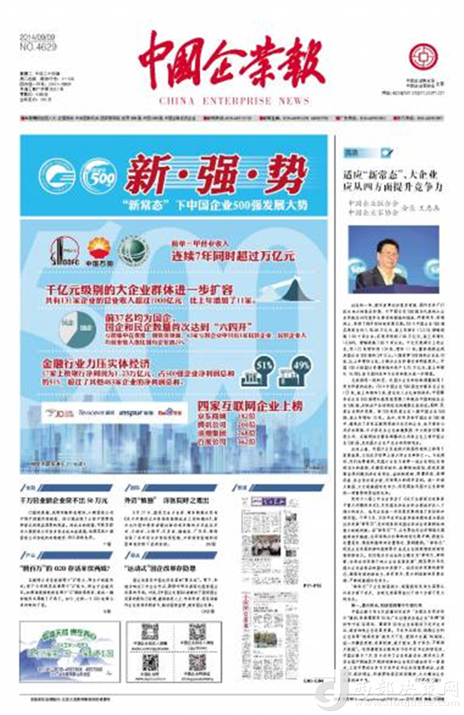 《中國(guó)企業(yè)報(bào)》是由中國(guó)企業(yè)聯(lián)合會(huì)、中國(guó)企業(yè)家協(xié)會(huì)主管主辦,是中國(guó)唯一以企業(yè)和企業(yè)家為報(bào)道核心的中央級(jí)媒體?!吨袊?guó)企業(yè)報(bào)》是一張專(zhuān)為中國(guó)企業(yè)創(chuàng)辦的報(bào)紙。1988年1月4日,由國(guó)家經(jīng)委主辦,中國(guó)企業(yè)管理協(xié)會(huì)承辦的《中國(guó)企業(yè)報(bào)》正式創(chuàng)刊。陳云同志為報(bào)紙題寫(xiě)了報(bào)頭,鄧力群任報(bào)社名譽(yù)顧問(wèn),袁寶華任報(bào)社名譽(yù)社長(zhǎng)。從1988年創(chuàng)辦至今,秉承“面向企業(yè),為企業(yè)服務(wù)”的辦報(bào)宗旨,親歷和記錄著中國(guó)企業(yè)的改革進(jìn)程,同時(shí)伴隨著中國(guó)企業(yè)的發(fā)展壯大而不斷成長(zhǎng)。經(jīng)過(guò)20多年的實(shí)踐探索,在報(bào)道企業(yè)新聞、推動(dòng)企業(yè)改革、維護(hù)企業(yè)權(quán)益、促進(jìn)企業(yè)發(fā)展等方面,逐步形成了自身的風(fēng)格和特色,專(zhuān)業(yè)性、權(quán)威性日益得到了企業(yè)界和新聞界的認(rèn)同。