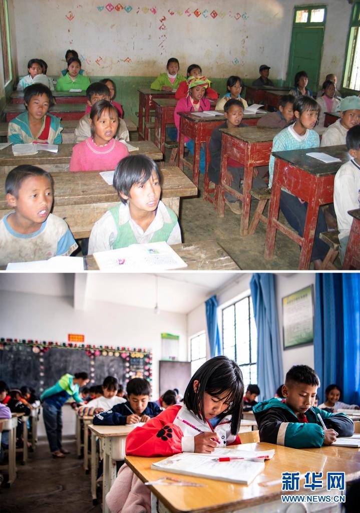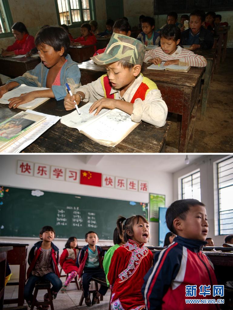 這張拼版照片的上圖:2003年12月6日,云南省瀾滄拉祜族自治縣富邦鄉(xiāng)半山小學(xué)的孩子們在上課(新華社記者 李銀 攝);下圖:2021年3月2日,云南省瀾滄拉祜族自治縣富邦鄉(xiāng)半山小學(xué)已撤并到富邦鄉(xiāng)中心完小,這是孩子們在教室里上課(新華社記者 江文耀 攝)。新華社發(fā)