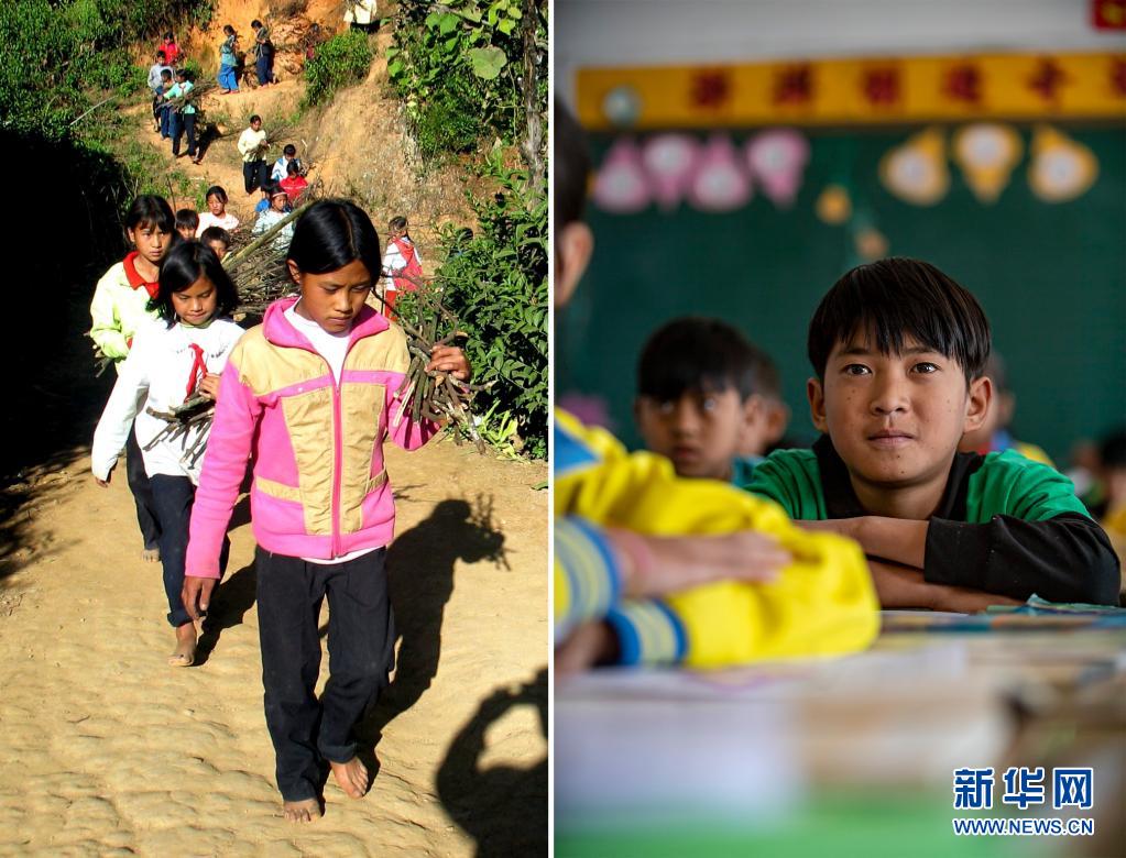 這張拼版照片的左圖:2003年12月6日,云南省瀾滄拉祜族自治縣富邦鄉(xiāng)半山村小學(xué)的學(xué)生李娜兒(前)在拾柴(新華社記者 李銀 攝);右圖:2021年3月2日,李娜兒的兒子在富邦鄉(xiāng)中心完小五年級的課堂上(新華社記者 江文耀 攝)。新華社發(fā)